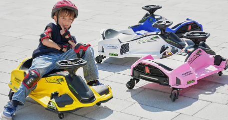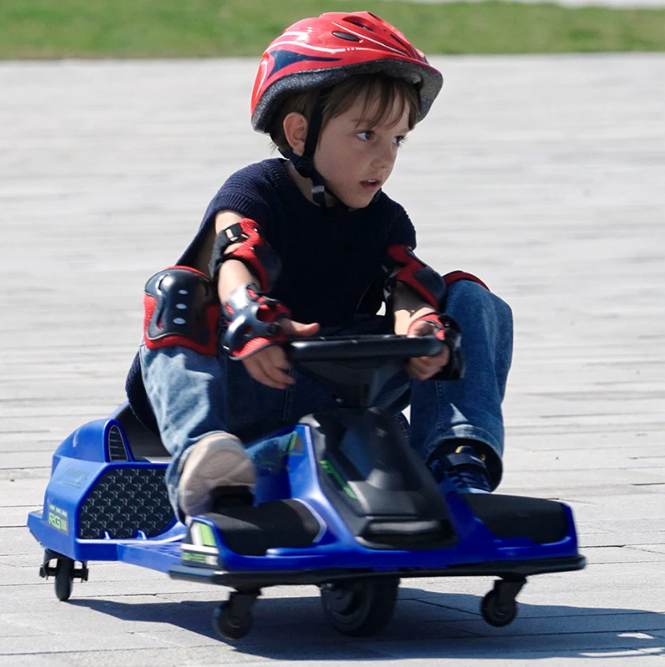 El KidRacer 360 se entrega con casco y protecciones para rodillas y codos, para minimizar los riesgos durante las carreras y los derrapes.